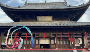 大雄宝殿を背景、太陽光を照明、風に乗って舞踊る
